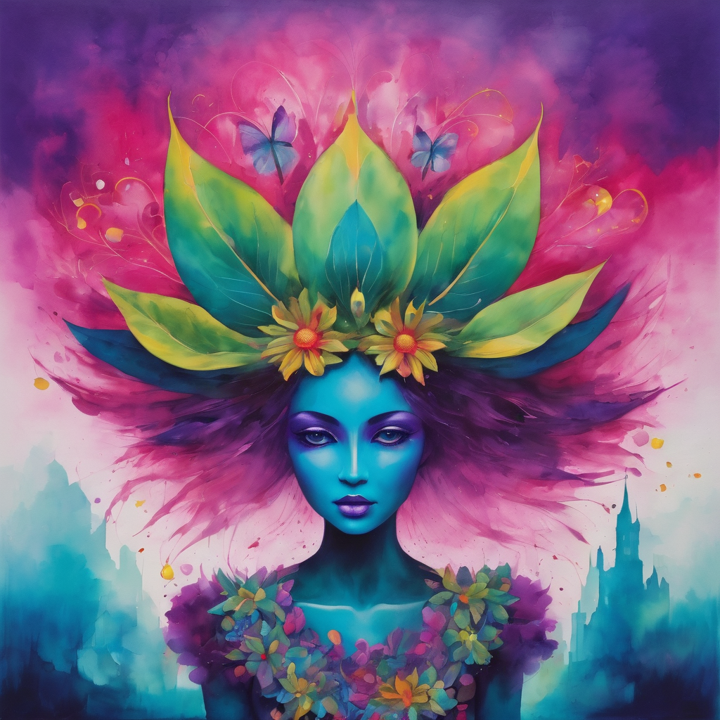 This artwork exudes a lively and imaginative spirit, utilizing bold colors and whimsical shapes to create a sense of wonder. The central figure, a fantastical creature with a large, blooming flower head, immediately captures attention with its vibrant pink and green palette. The exaggerated size of the flower, juxtaposed with the smaller, cartoon-like body of the creature, evokes a sense of playfulness and curiosity. The purple background accentuates the vividness of the main subject, while the blue, abstract shapes at the bottom of the image lend an element of mystery and abstraction.