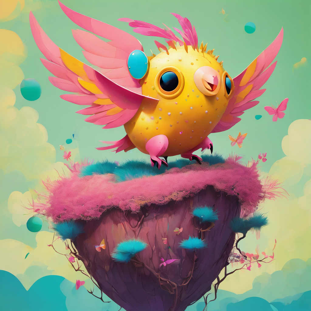 The artwork is a whimsical and surreal illustration featuring a creature with a yellow body and pink wings, seemingly flying or floating. Below it is a stylized nest or platform with a spiky texture, containing several blue oval shapes. The design is cartoonish with bold outlines and a playful color palette on a light green background.