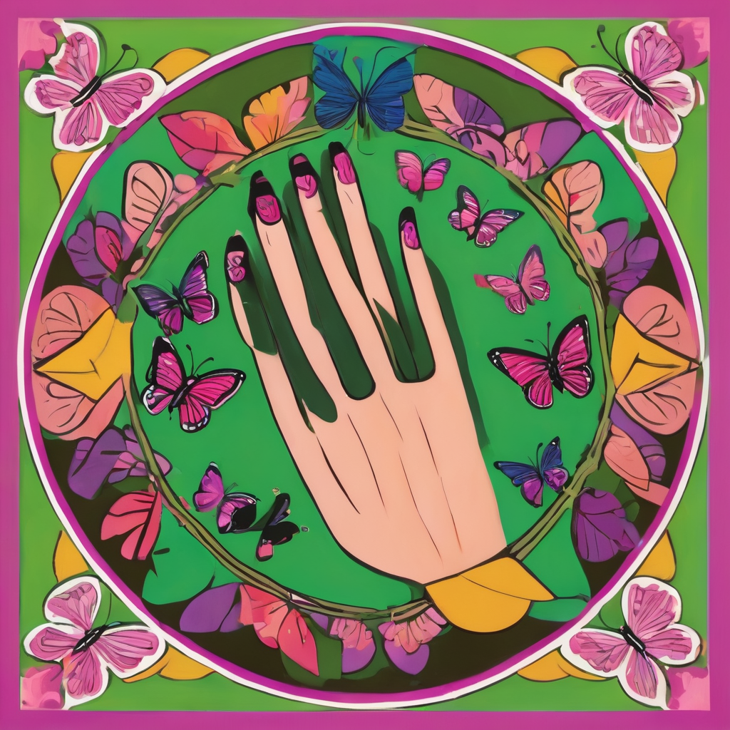 The artwork is a colorful and stylized depiction of pink and brown fingers arranged in a circular fashion on a green background. Surrounding this central motif are whimsical purple butterflies, and there are decorative, abstract elements with black markings giving a sense of symmetry and balance to the piece. The entire composition is framed by a light green, wavy border that complements the vivid colors and playful design.