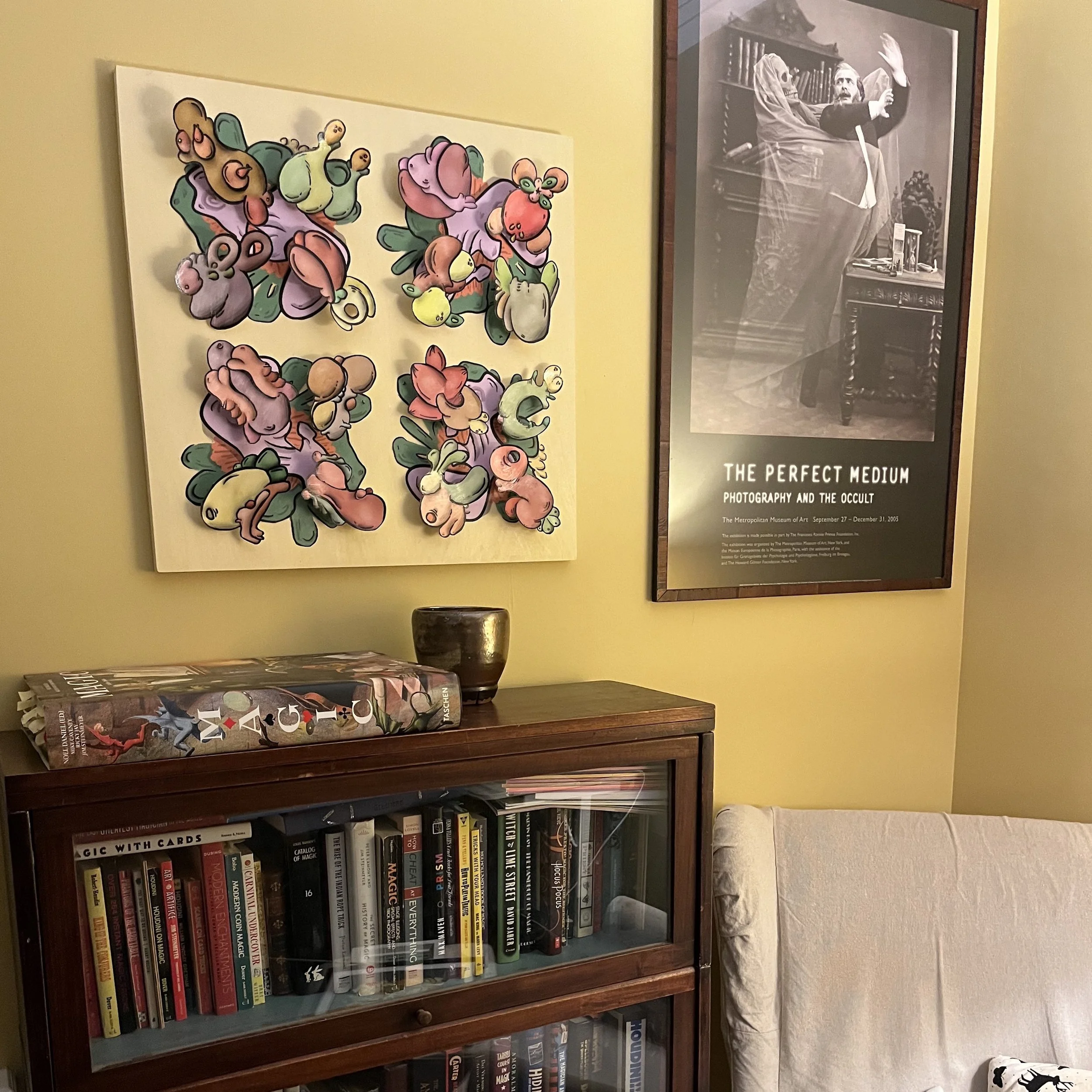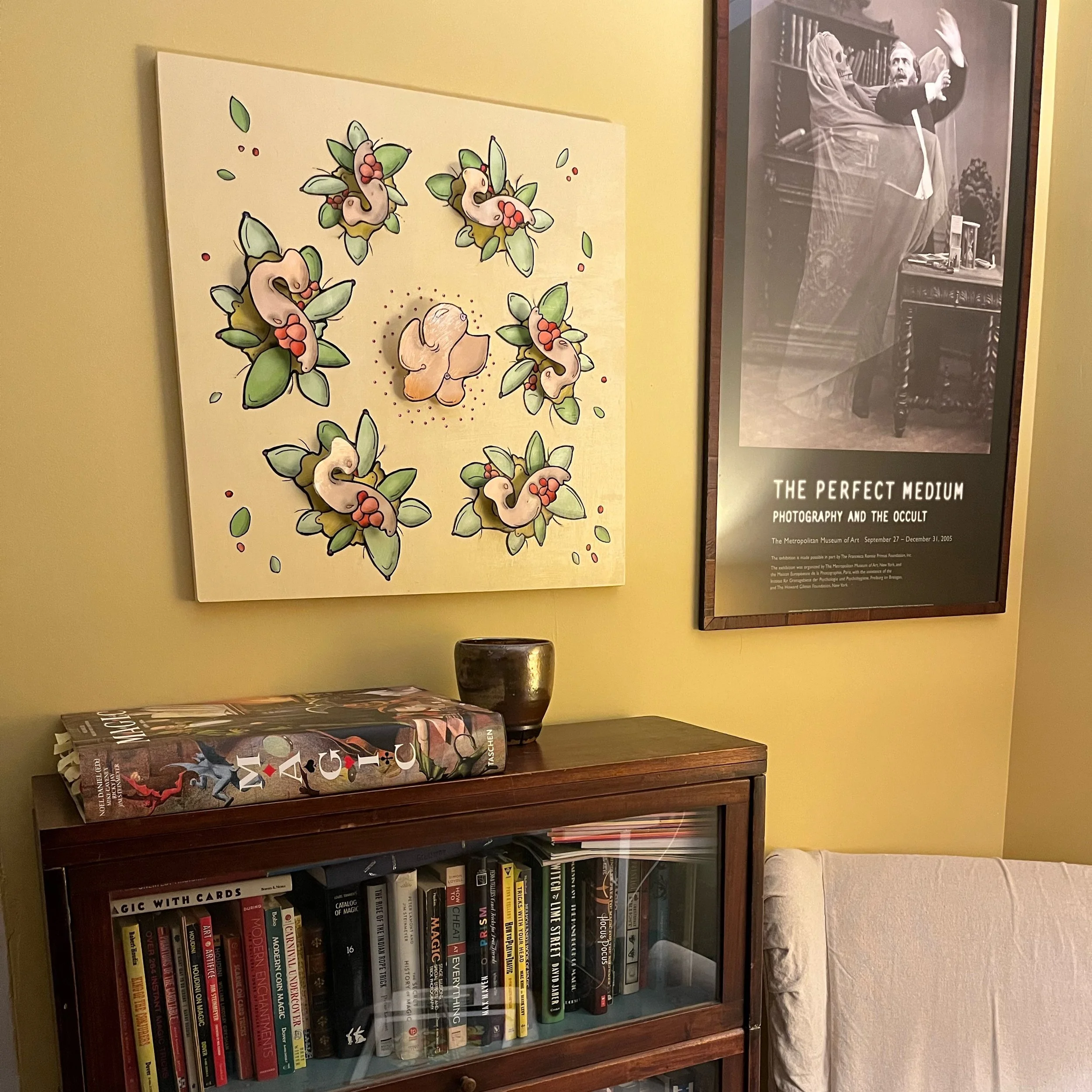 Continuing to explore ways to add movement to my paintings led me to these Springboards. Pieces of the pictures are mounted on small metal springs, giving them not only an elevated relief, but also a springy, silly movement when “activated” by an external force. If indoors, this force could be a hand-held rod with a feather at the tip brushing against the painting, while outside it might be a breeze; The Springboards may come to life by either humans or nature.